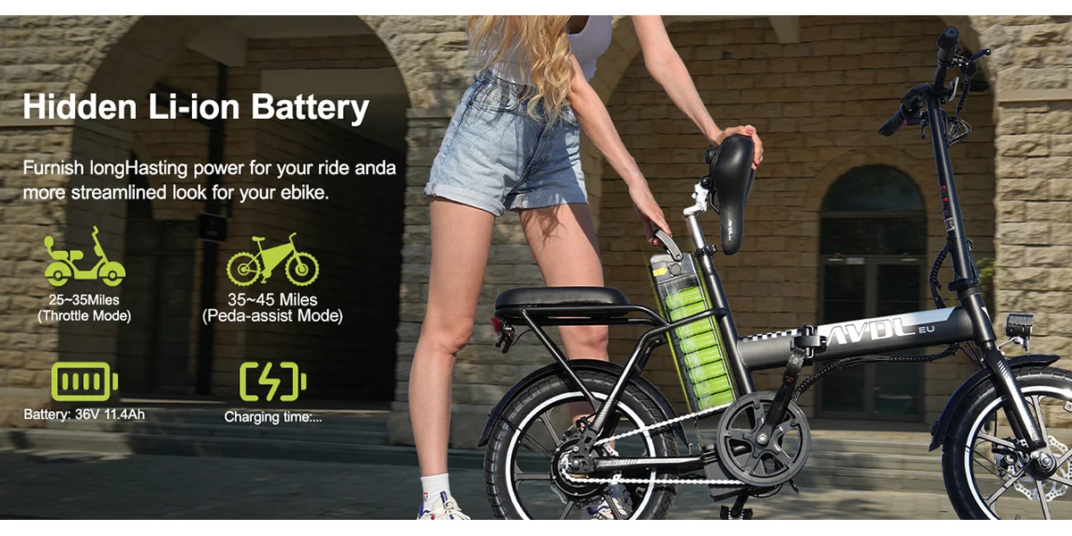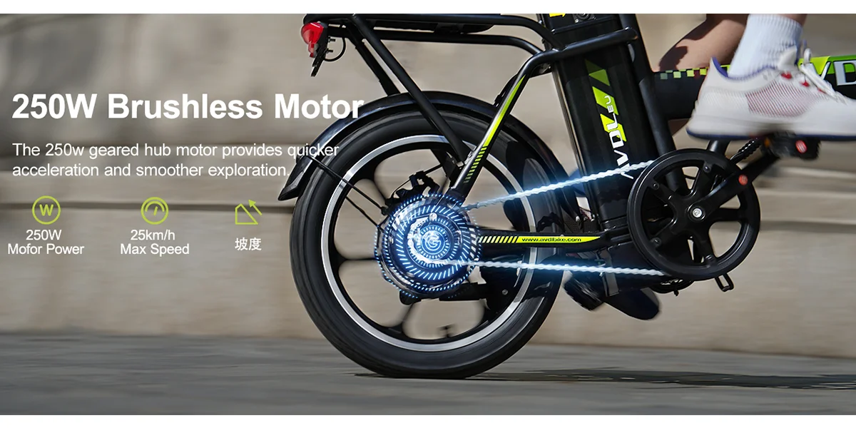 Leistungsstarker bürstenloser 250-W-/36-V-Motor – Mit dem AVDLEU A10-Elektrofahrrad können Sie problemlos eine Höchstgeschwindigkeit von 25 km/h erreichen.